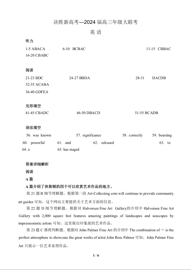 江苏省决胜新高考2023-2024学年高三下学期2月大联考 英语答案