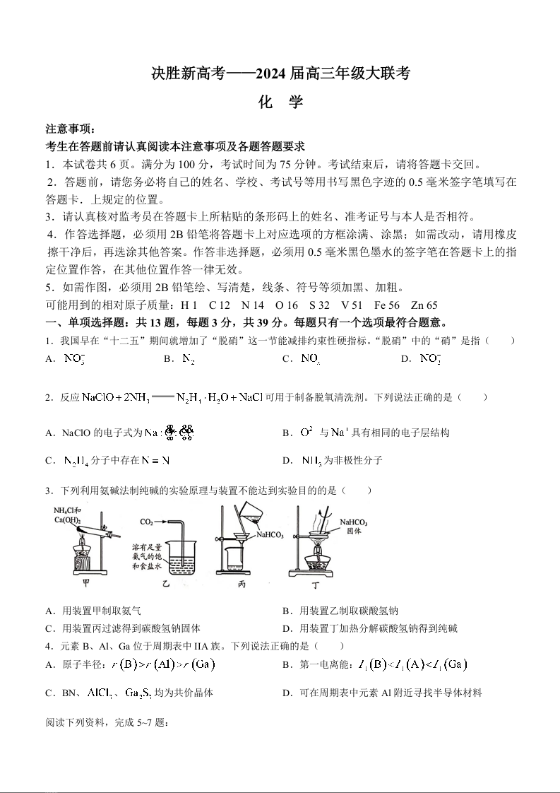 江苏省决胜新高考2023-2024学年高三下学期2月大联考 化学