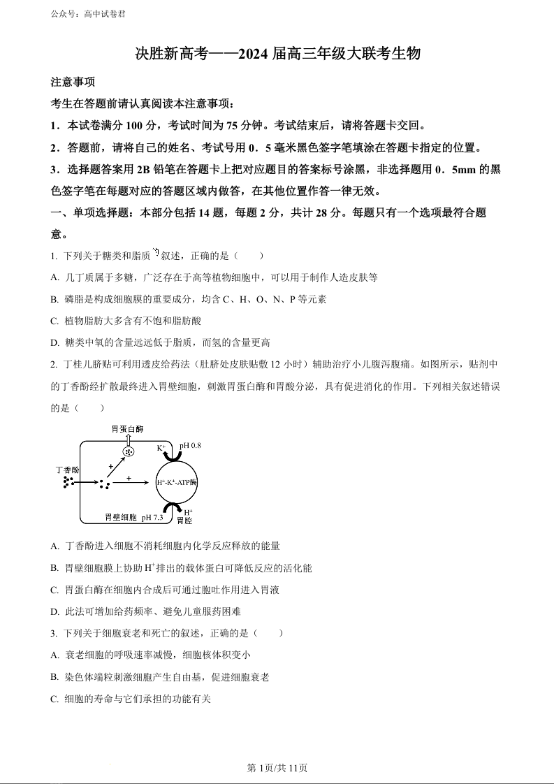江苏省决胜新高考2023-2024学年高三下学期2月大联考 生物