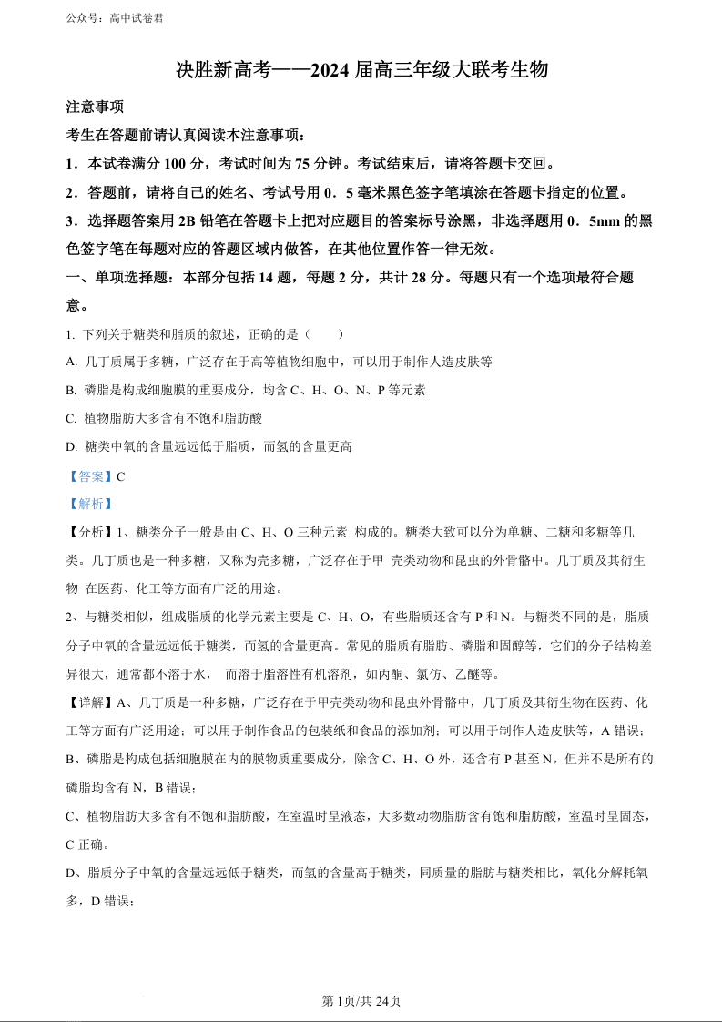 江苏省决胜新高考2023-2024学年高三下学期2月大联考 生物答案