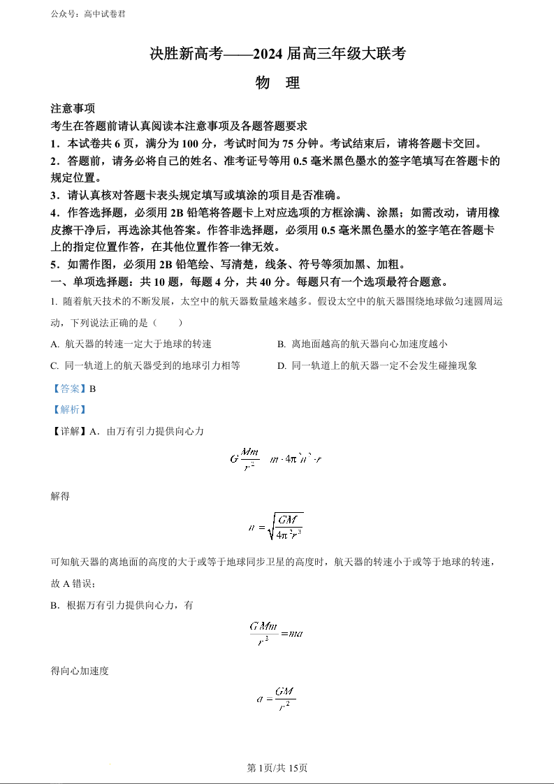 江苏省决胜新高考2023-2024学年高三下学期2月大联考 物理答案