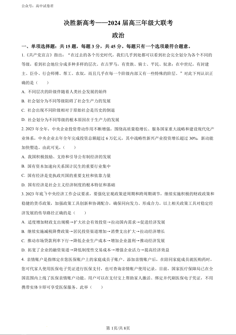 江苏省决胜新高考2023-2024学年高三下学期2月大联考 政治