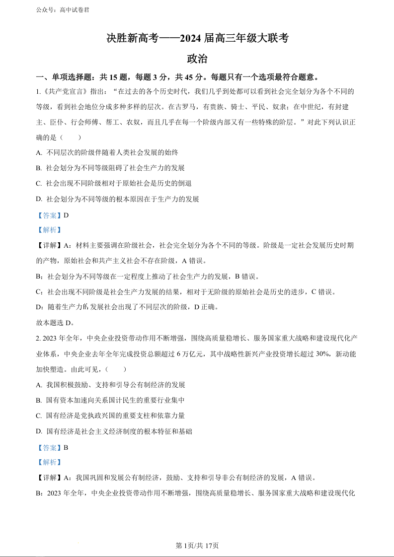 江苏省决胜新高考2023-2024学年高三下学期2月大联考 政治答案
