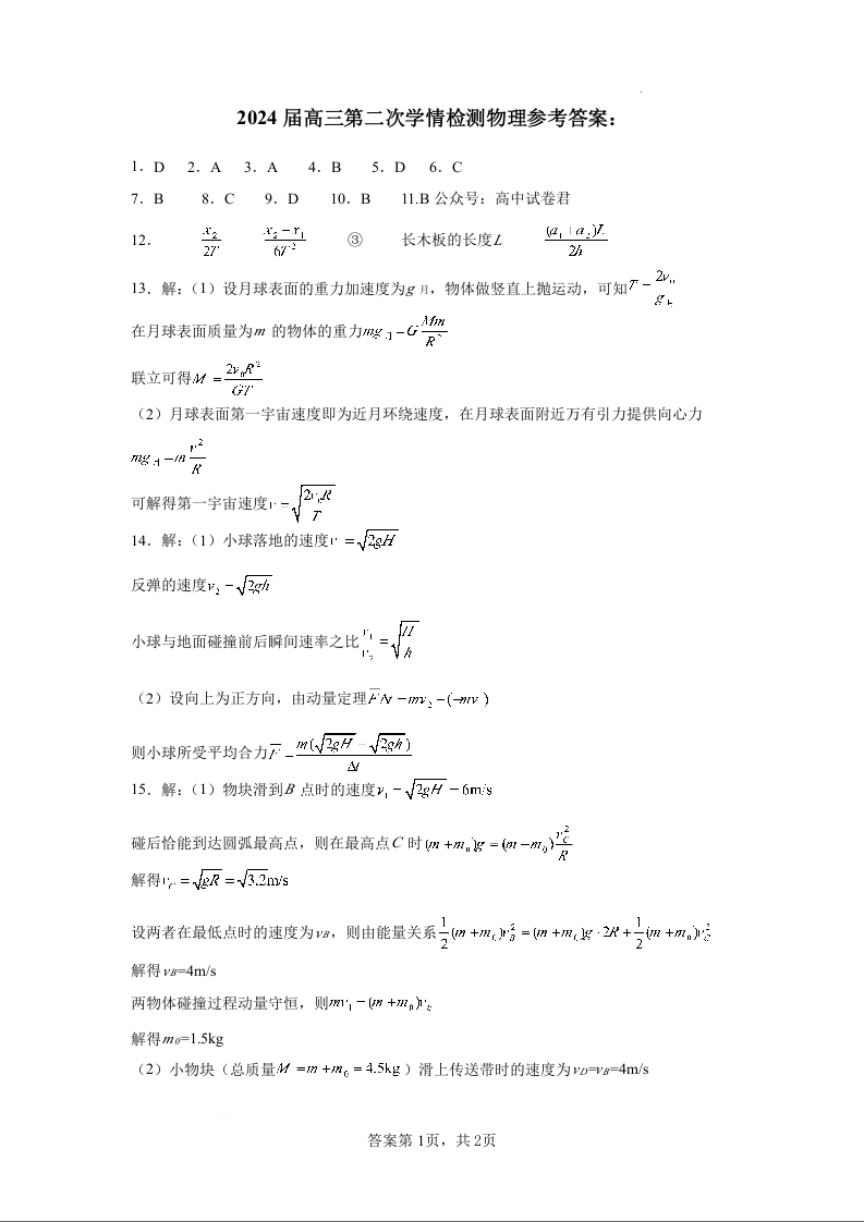 江苏省连云港市部分学校2023-2024学年高三上学期10月联考 物理答案
