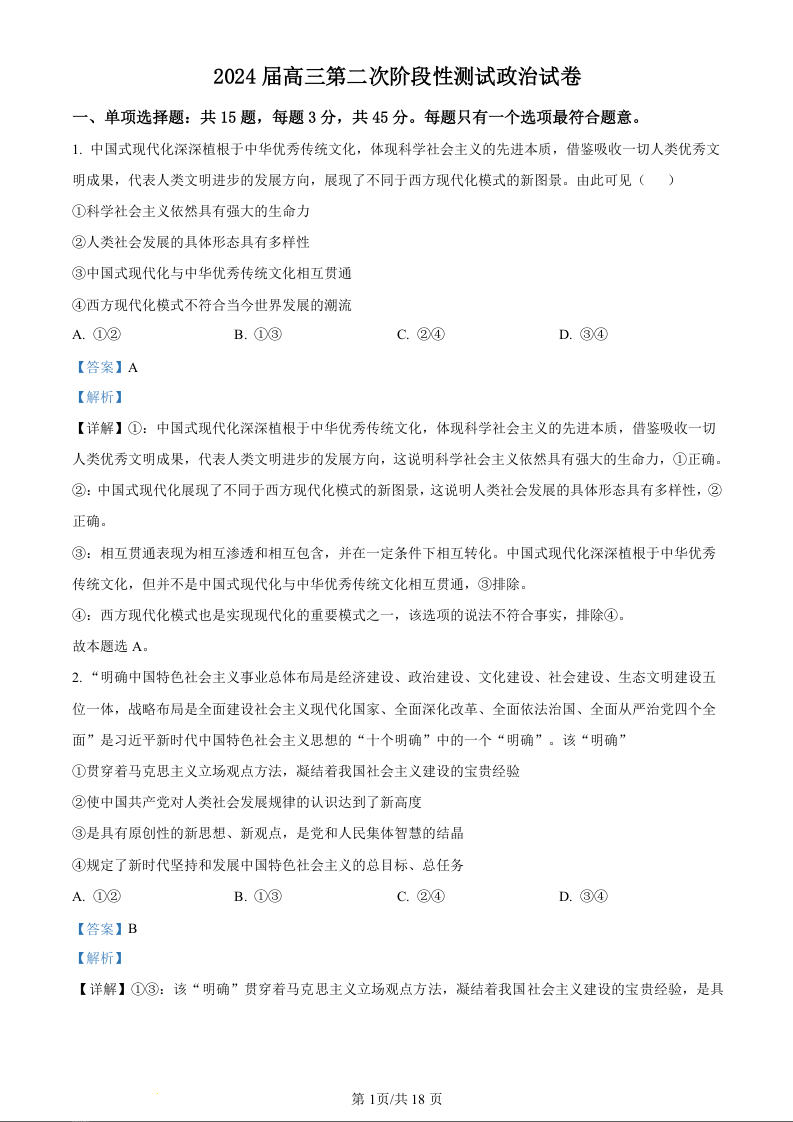 江苏省连云港市部分学校2023-2024学年高三上学期10月联考 政治答案
