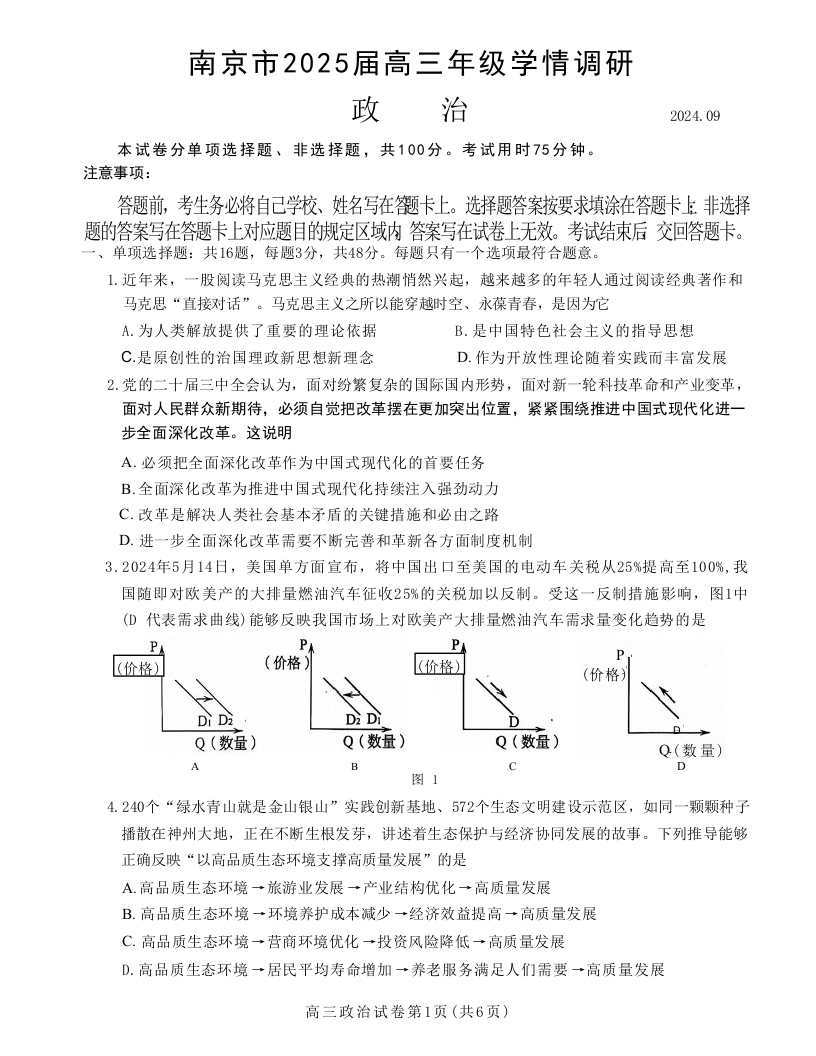 江苏省南京市2025届高三年级学情调研+政治