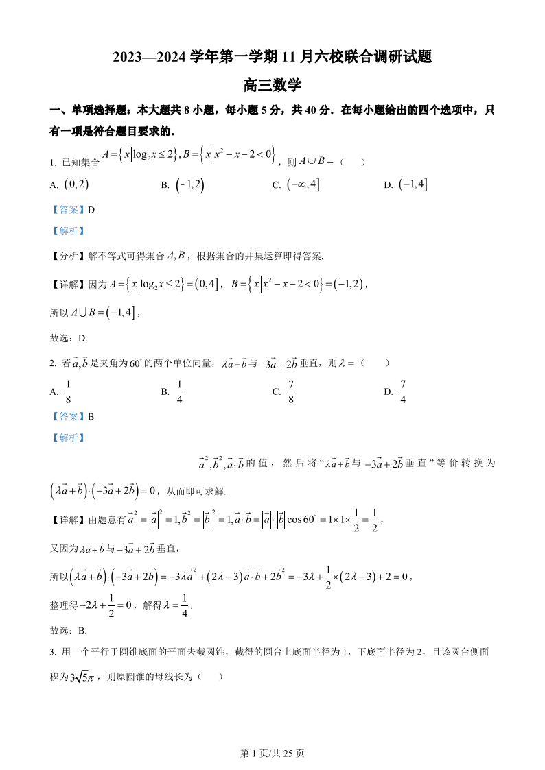 江苏省南京市六校2023-2024学年高三上学期期中联合调研 数学答案