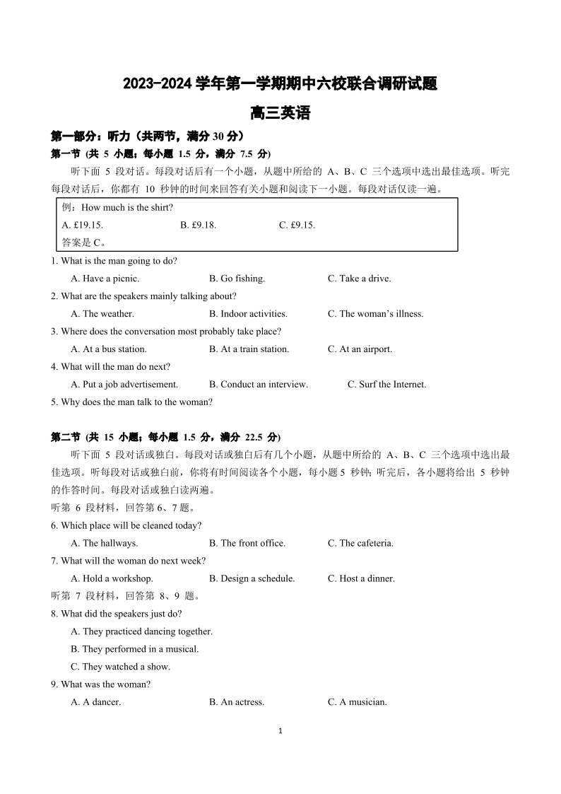 江苏省南京市六校2023-2024学年高三上学期期中联合调研 英语