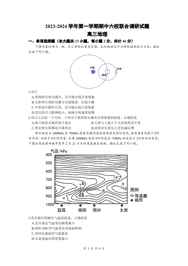 江苏省南京市六校2023-2024学年高三上学期期中联合调研 地理