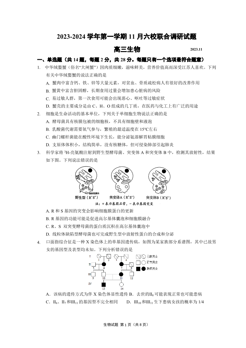 江苏省南京市六校2023-2024学年高三上学期期中联合调研 生物