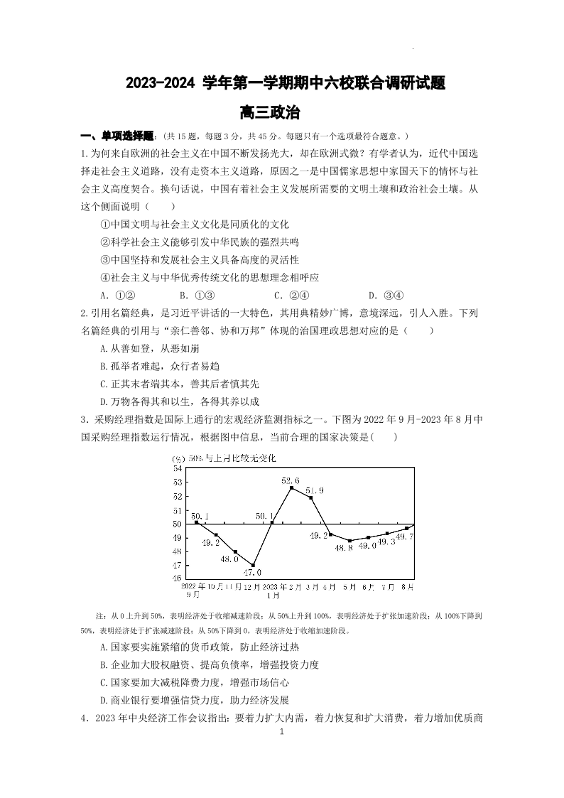 江苏省南京市六校2023-2024学年高三上学期期中联合调研 政治