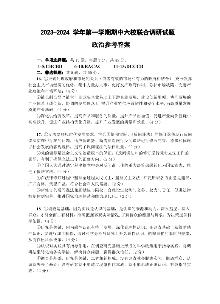 江苏省南京市六校2023-2024学年高三上学期期中联合调研 政治答案