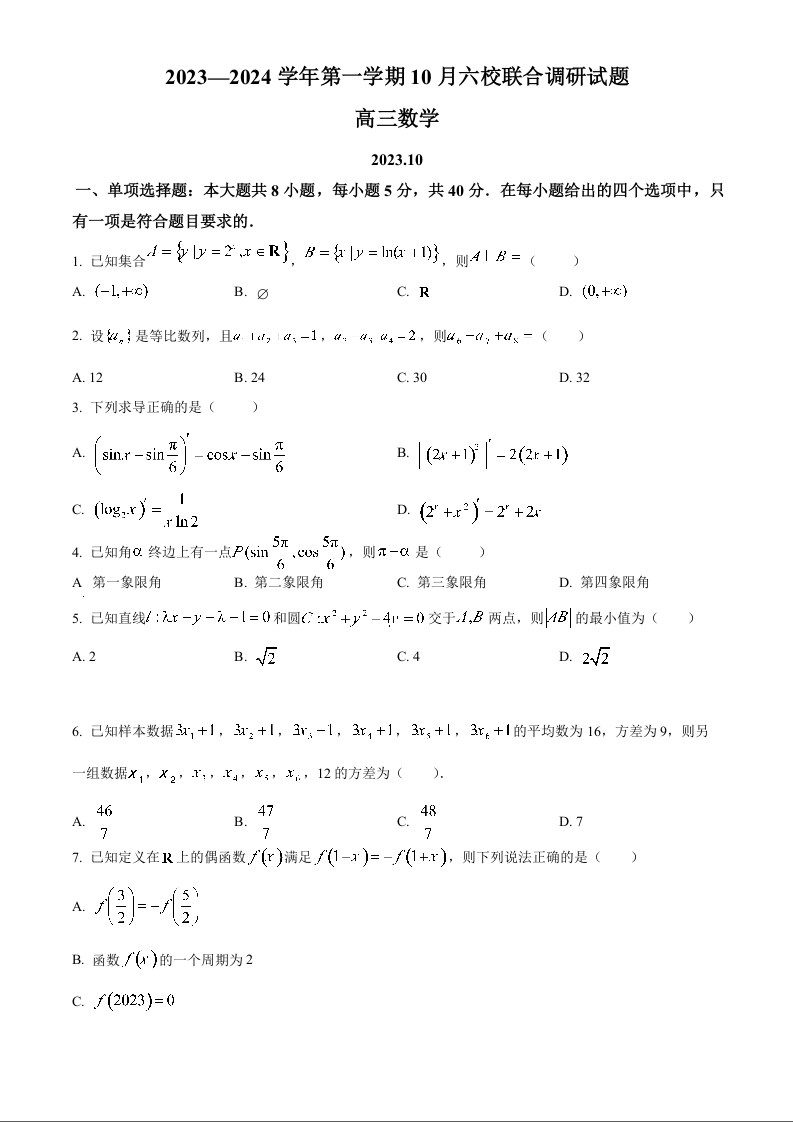 江苏省南京市六校联合体2023-2024学年高三上学期10月联合调研 数学