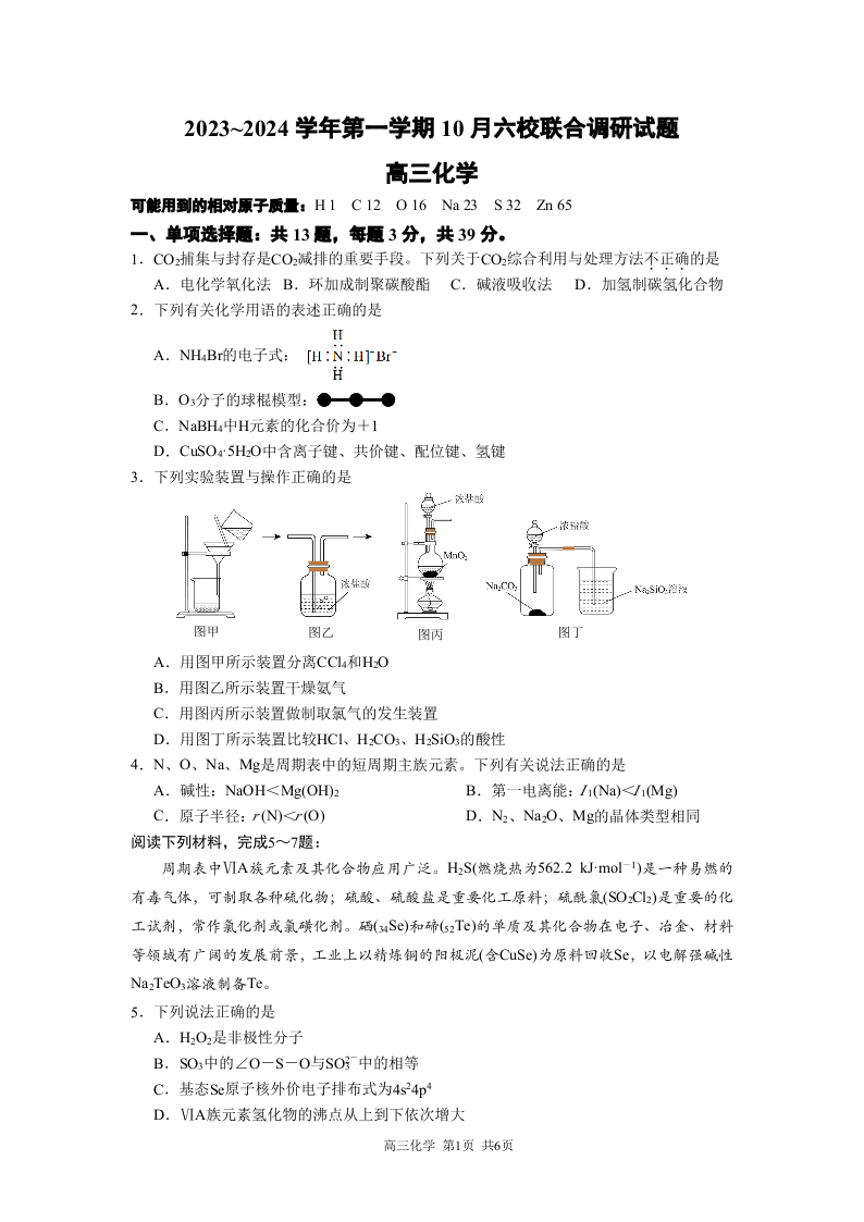 江苏省南京市六校联合体2023-2024学年高三上学期10月联合调研 化学
