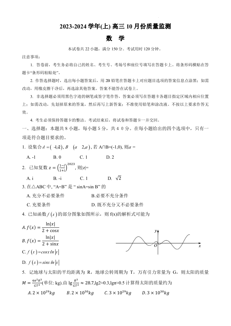江苏省南通市2024届高三上学期10月份质量监测 数学
