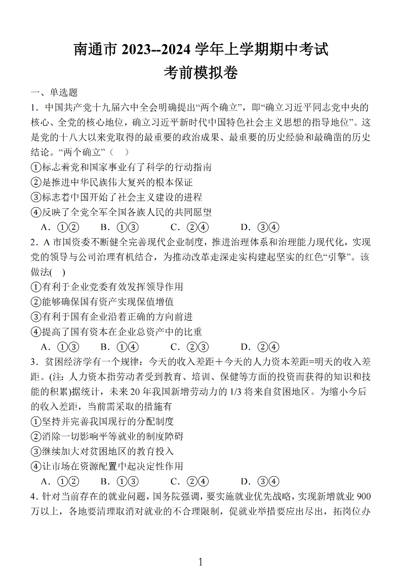 江苏省南通市2024届高三上学期期中考试考前模拟卷 政治