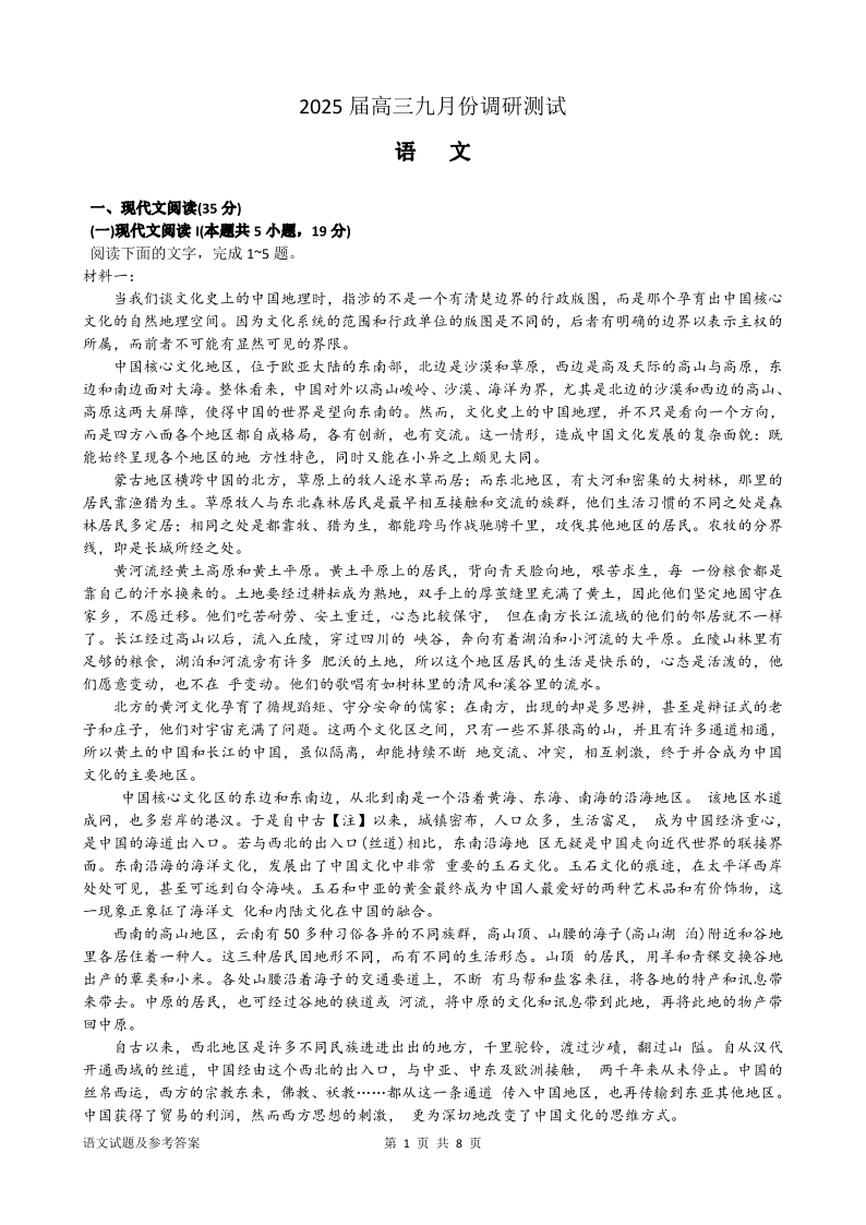 江苏省南通市2025届高三九月份调研测试+语文