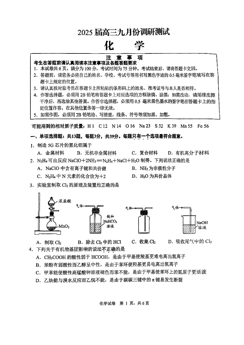 江苏省南通市2025届高三九月份调研测试+化学