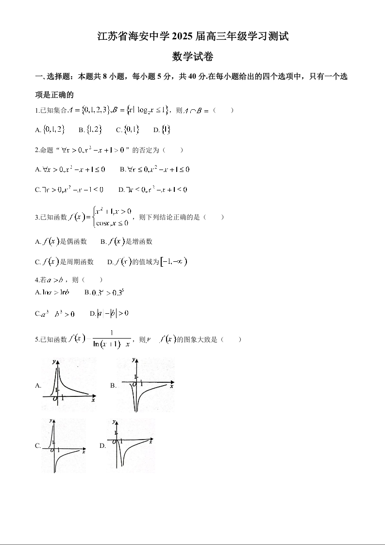 江苏省南通市海安高级中学2025届高三9月月考+数学