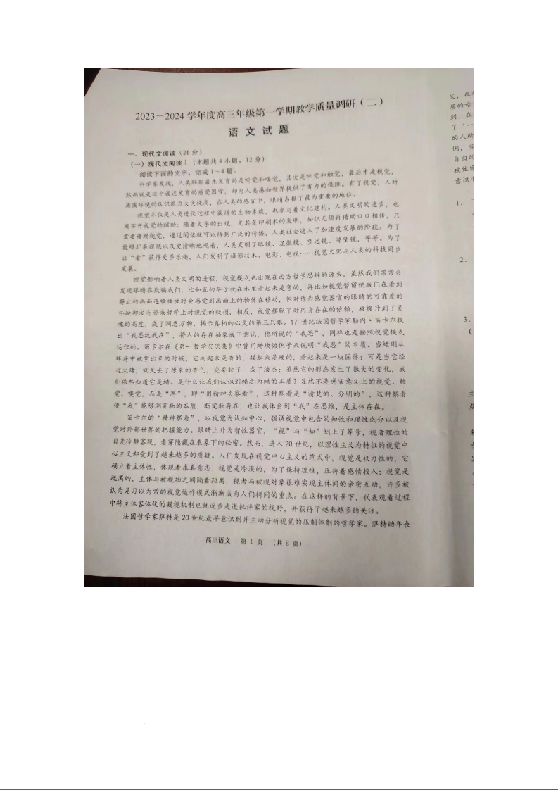 江苏省南通市如皋市2023-2024学年高三上学期调研(二)(期中)语文