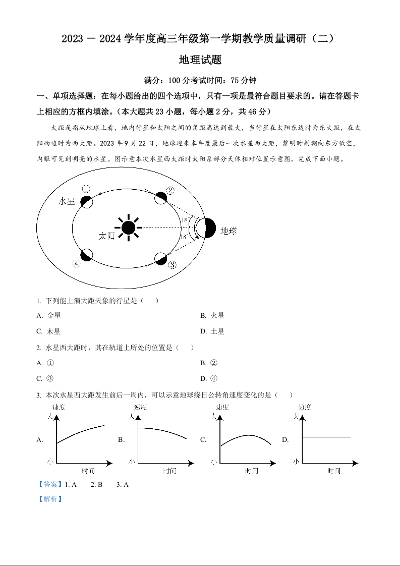 江苏省南通市如皋市2023-2024学年高三上学期调研(二)(期中)地理答案