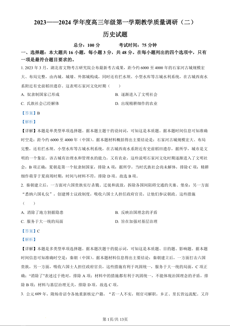 江苏省南通市如皋市2023-2024学年高三上学期调研(二)(期中)历史答案