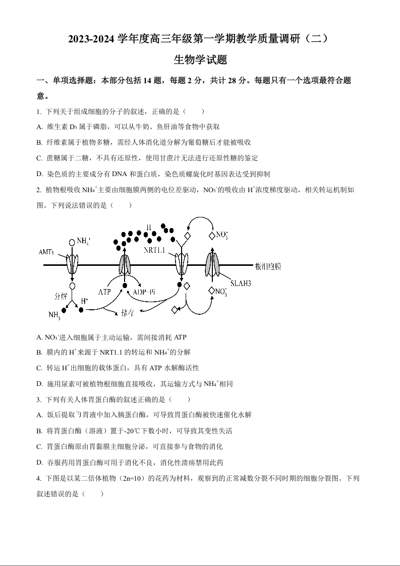 江苏省南通市如皋市2023-2024学年高三上学期调研(二)(期中)生物