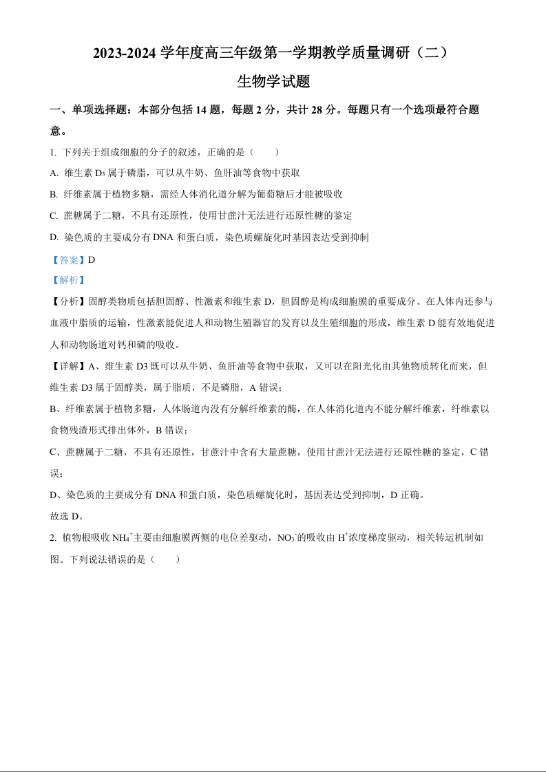 江苏省南通市如皋市2023-2024学年高三上学期调研(二)(期中)生物答案