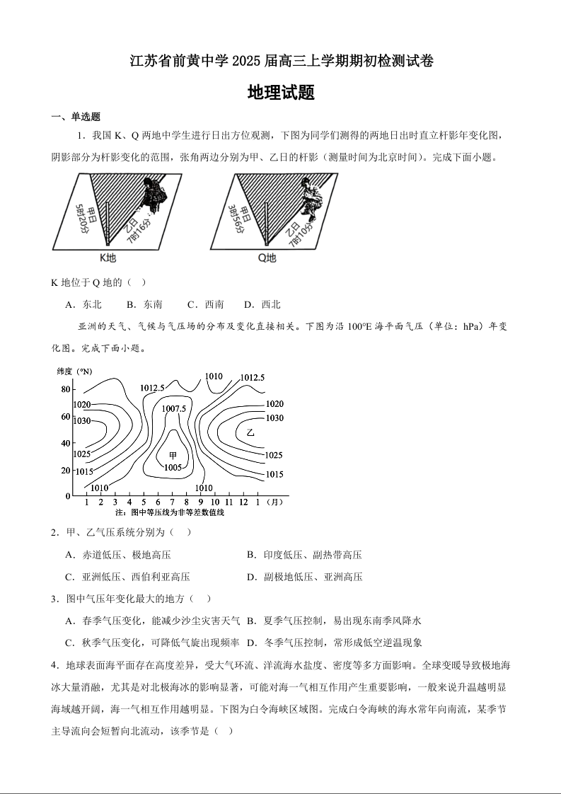江苏省前黄高级中学2024-2025学年高三上学期期初检测+地理