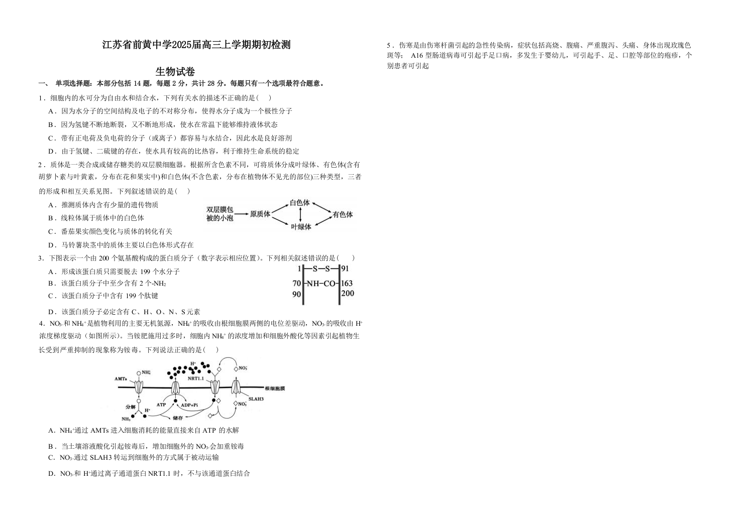 江苏省前黄高级中学2024-2025学年高三上学期期初检测+生物