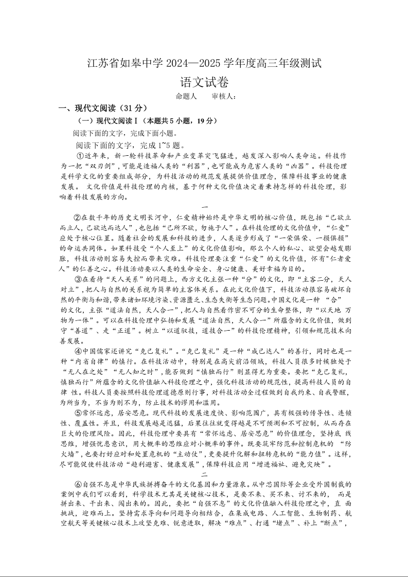 江苏省如皋中学2024-2025学年度高三年级期初测试+语文