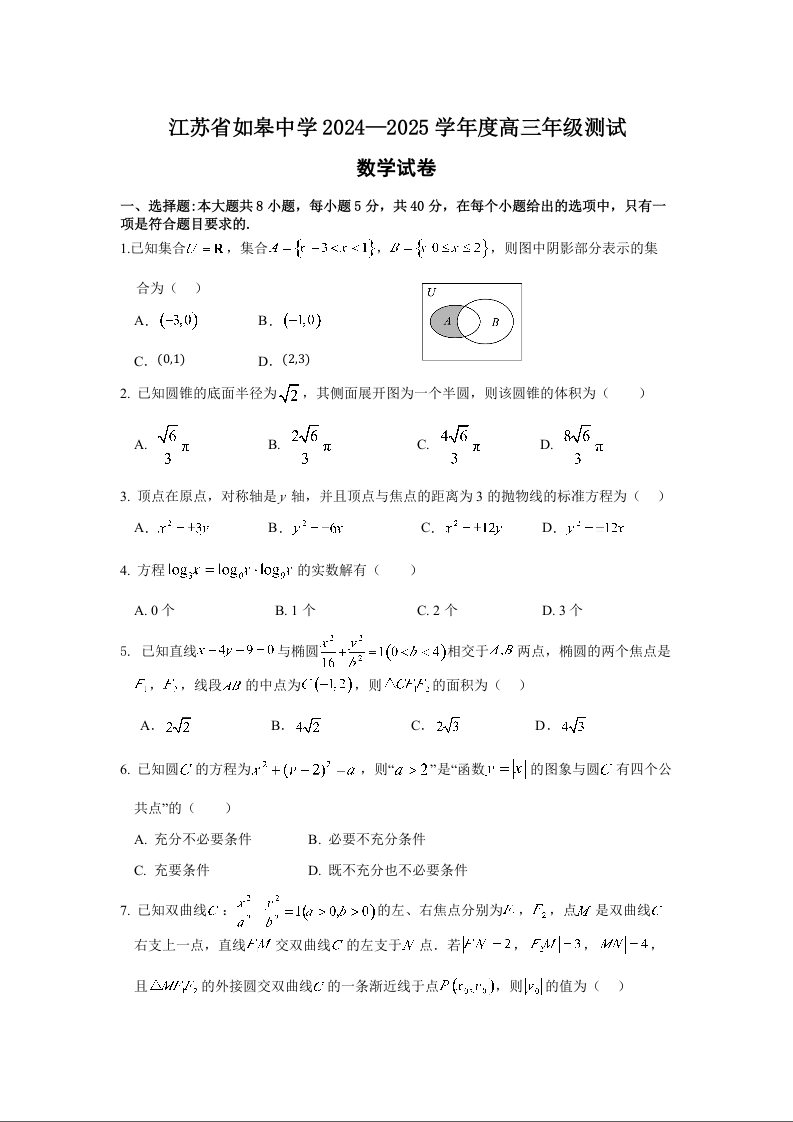 江苏省如皋中学2024-2025学年度高三年级期初测试+数学