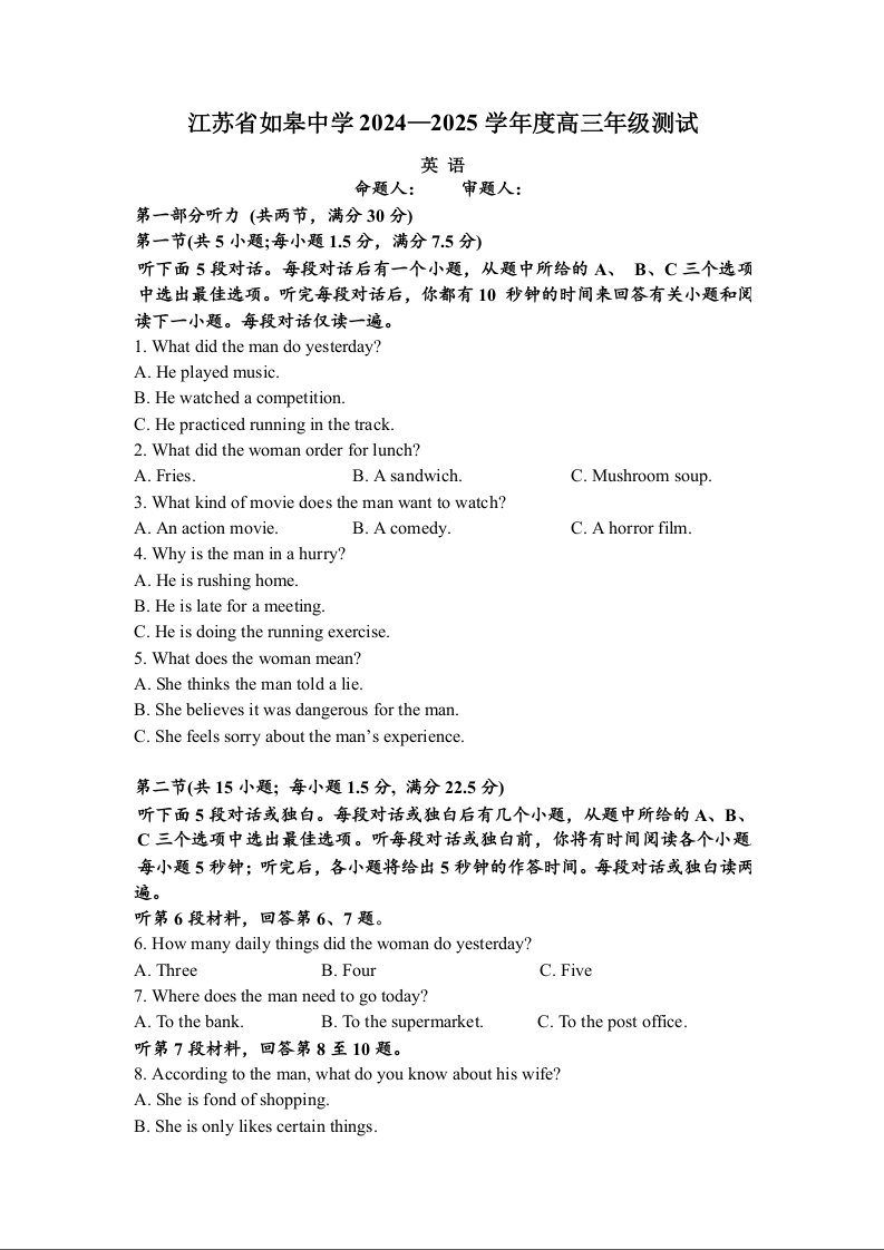 江苏省如皋中学2024-2025学年度高三年级期初测试+英语