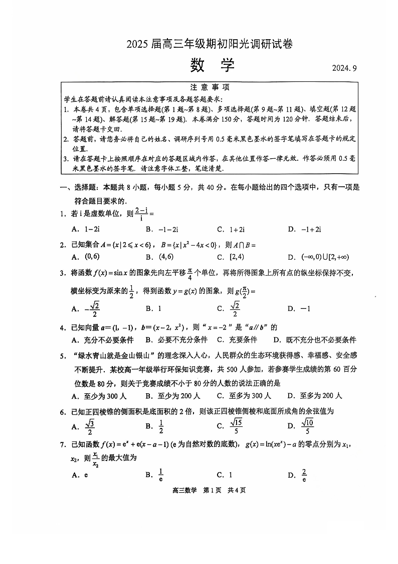江苏省苏州市2025届高三年级期初阳光调研试卷+数学