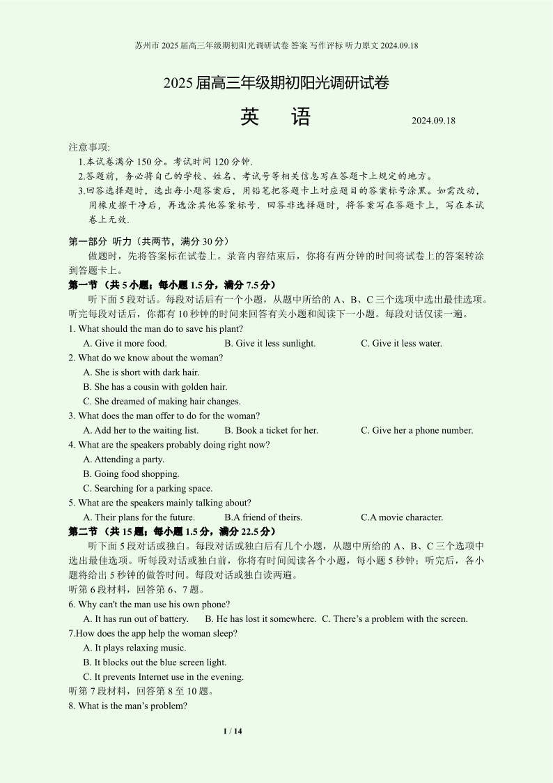 江苏省苏州市2025届高三年级期初阳光调研试卷+英语