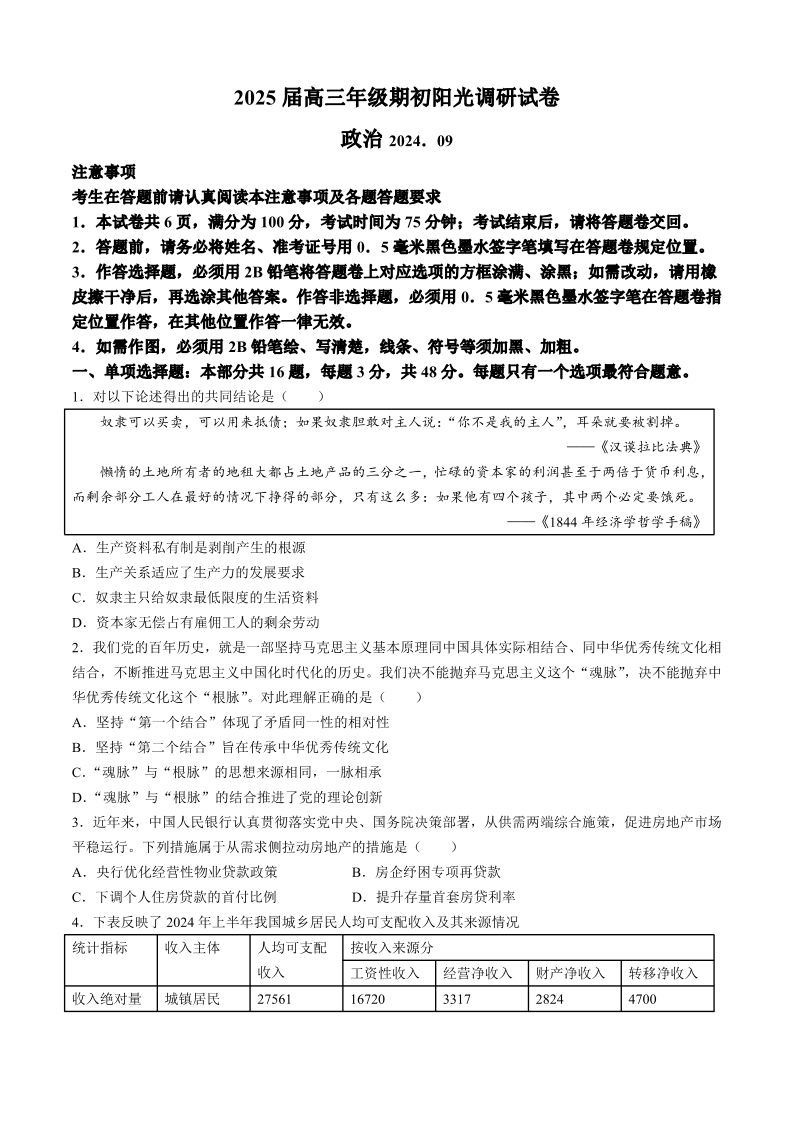 江苏省苏州市2025届高三年级期初阳光调研试卷+政治