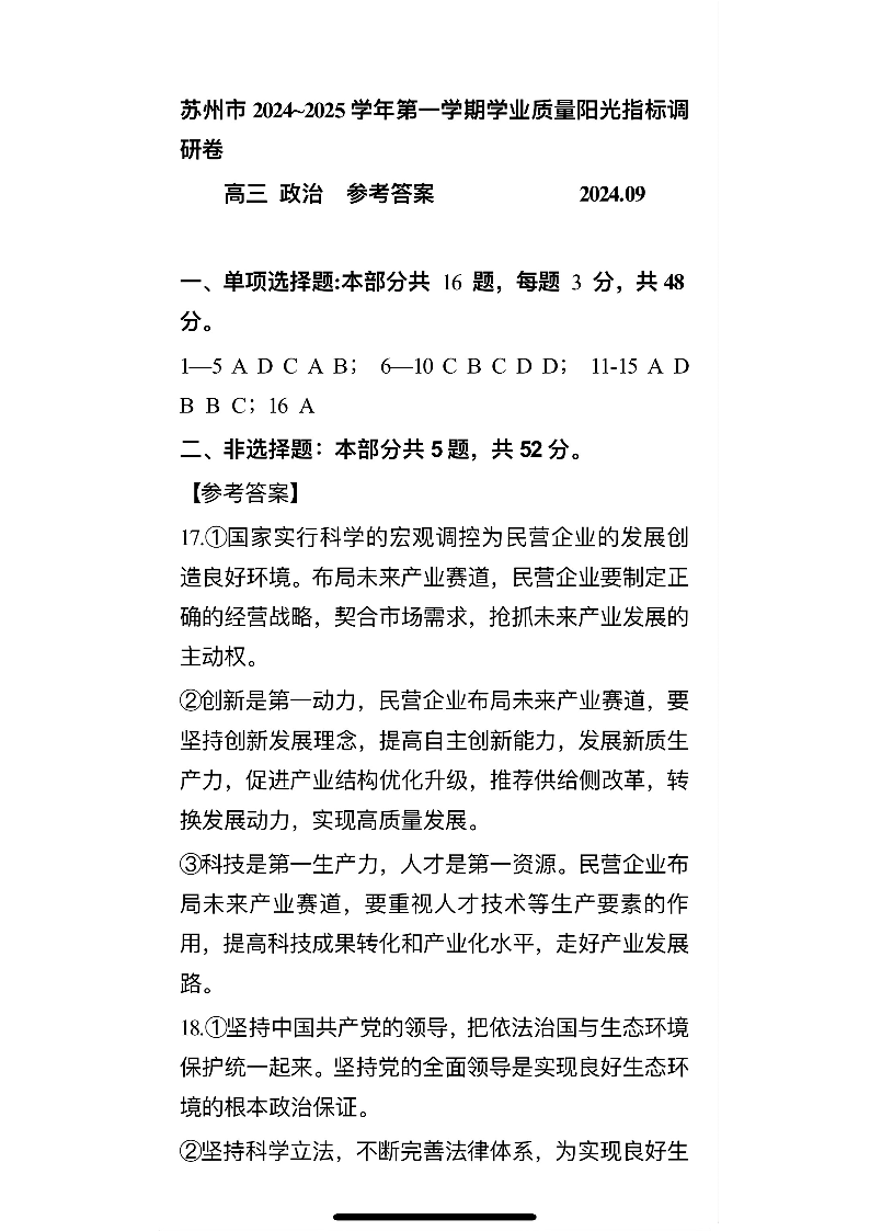 江苏省苏州市2025届高三年级期初阳光调研试卷+政治答案