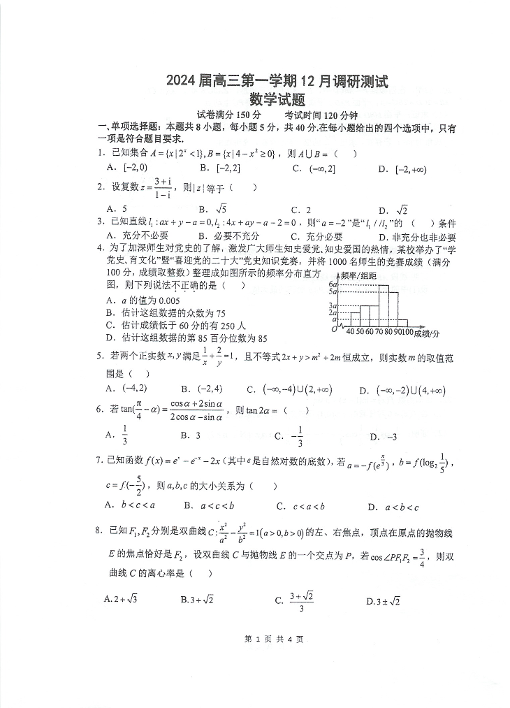 江苏省泰州中学、宿迁中学、宜兴中学2023-2024学年高三上学期12月调研测试 数学