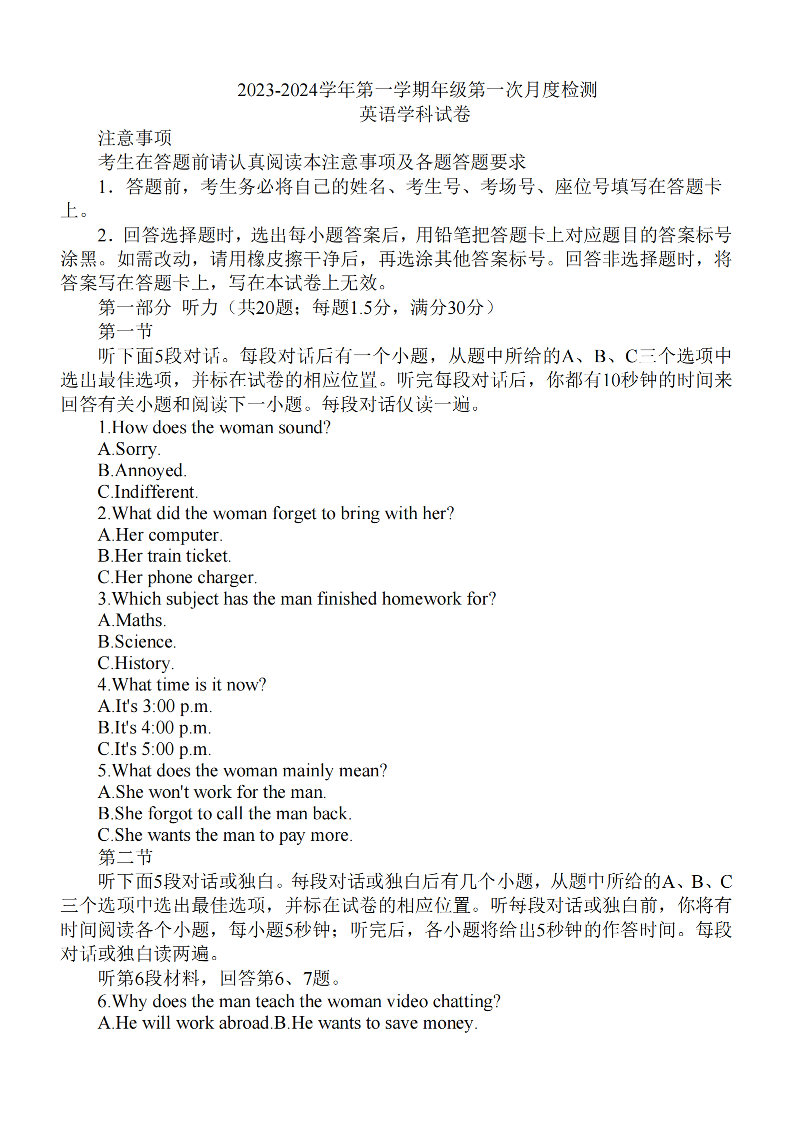 【英语试题+答案】泰州中学24届高三第一次质量检测