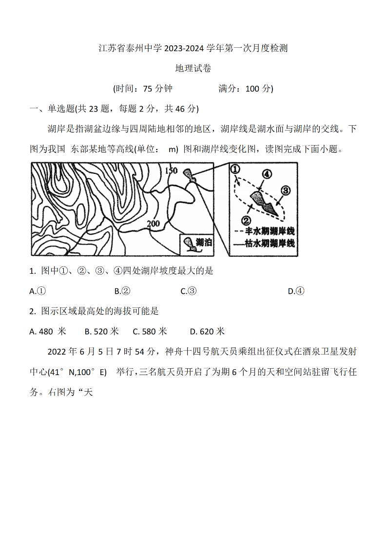 【地理试题+答案】泰州中学24届高三第一次质量检测
