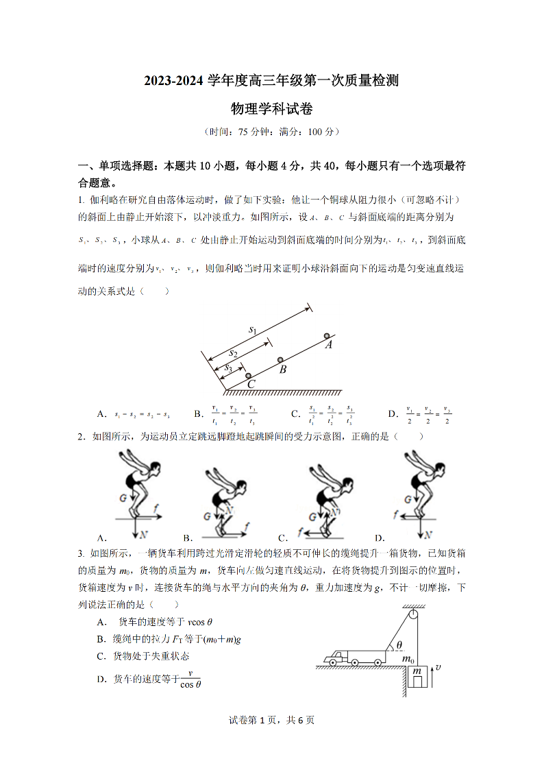 【物理试题+答案】泰州中学24届高三第一次质量检测