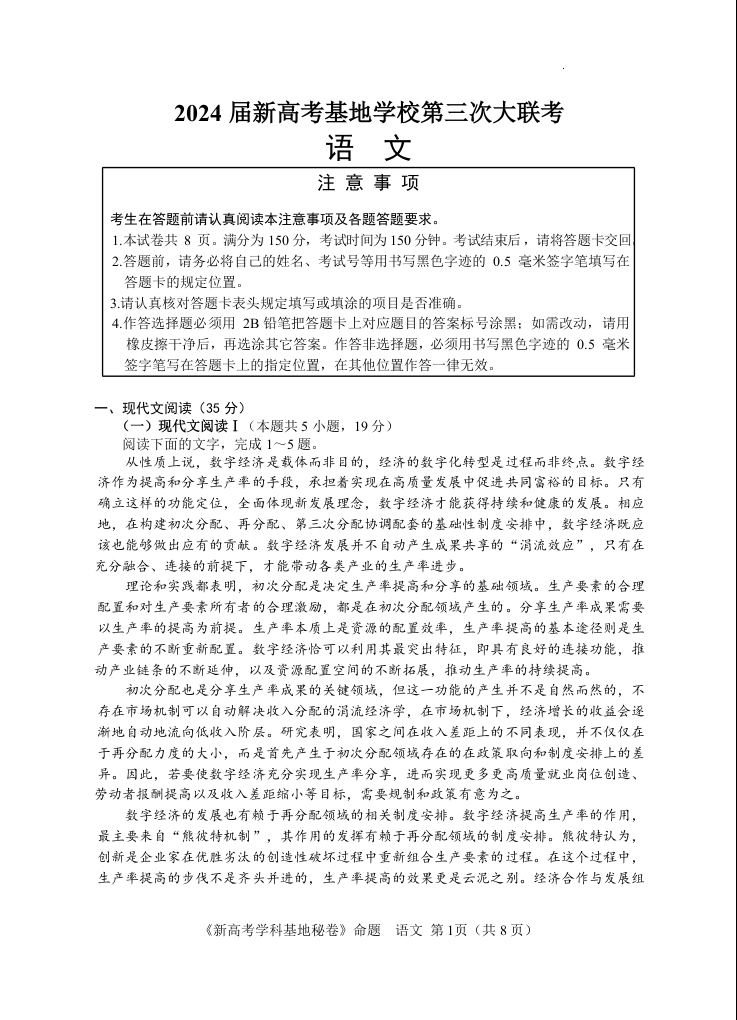 江苏省新高考基地学校2023-2024学年高三上学期第三次大联考 语文