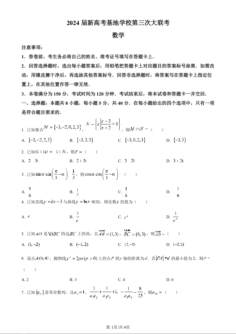 江苏省新高考基地学校2023-2024学年高三上学期第三次大联考 数学