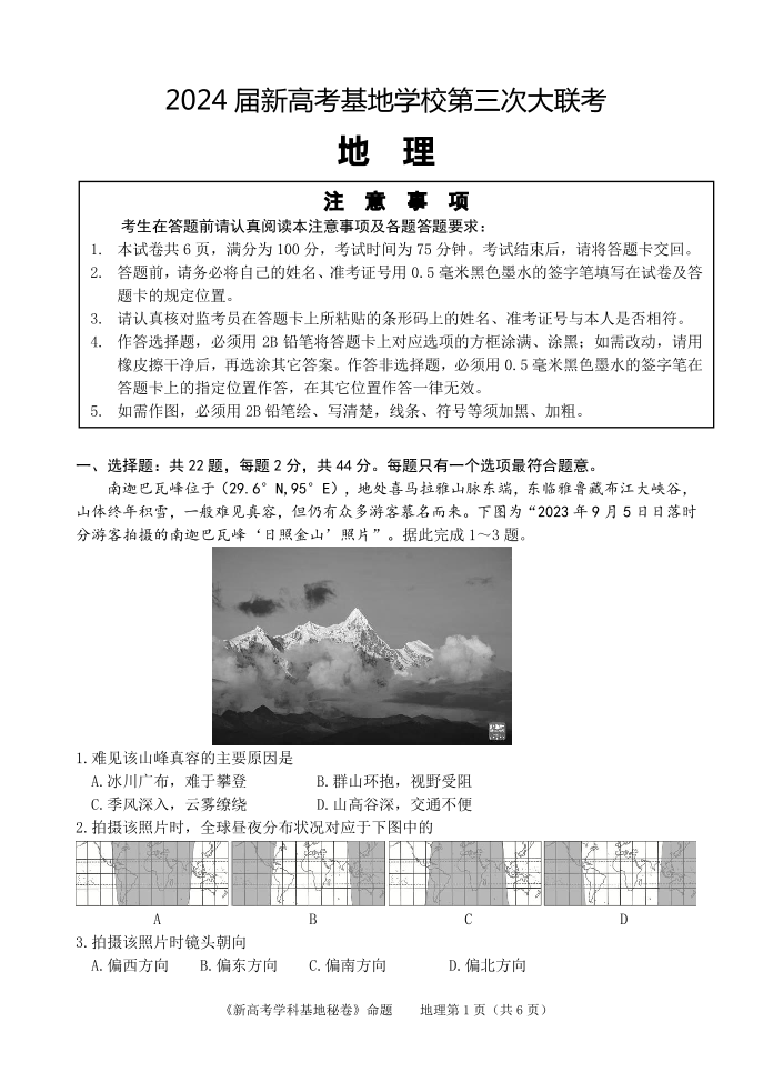江苏省新高考基地学校2023-2024学年高三上学期第三次大联考 地理