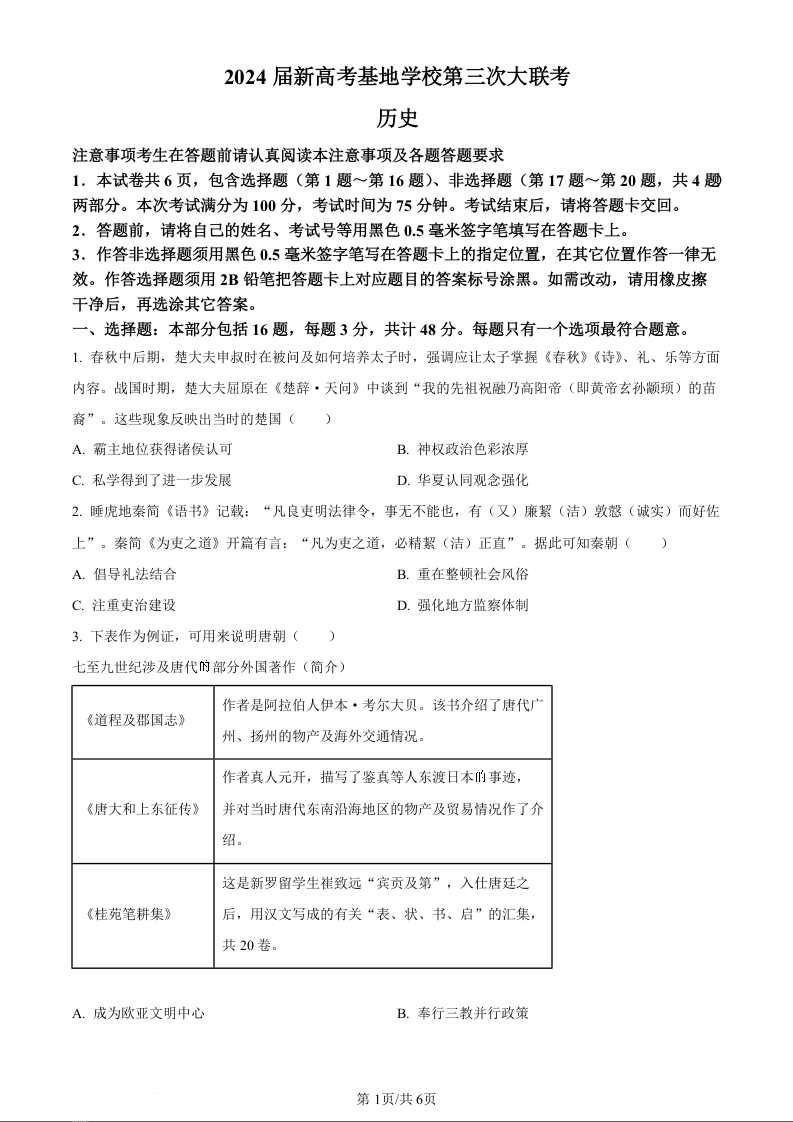江苏省新高考基地学校2023-2024学年高三上学期第三次大联考 历史