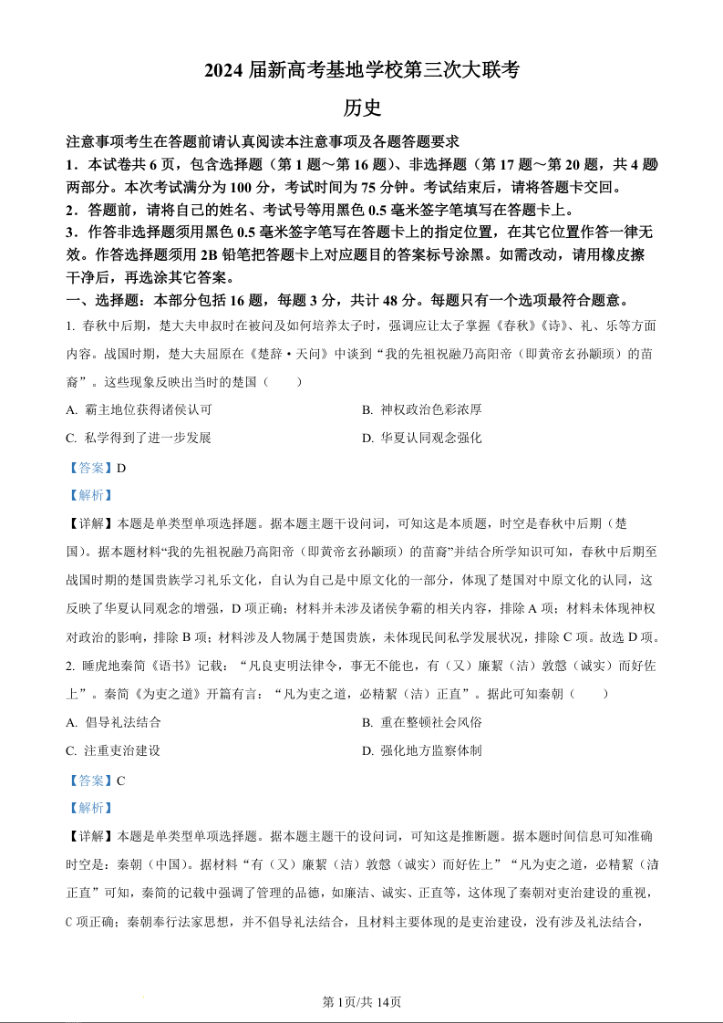 江苏省新高考基地学校2023-2024学年高三上学期第三次大联考 历史答案