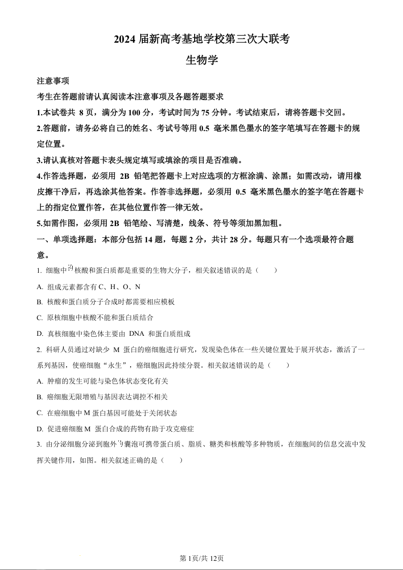 江苏省新高考基地学校2023-2024学年高三上学期第三次大联考 生物