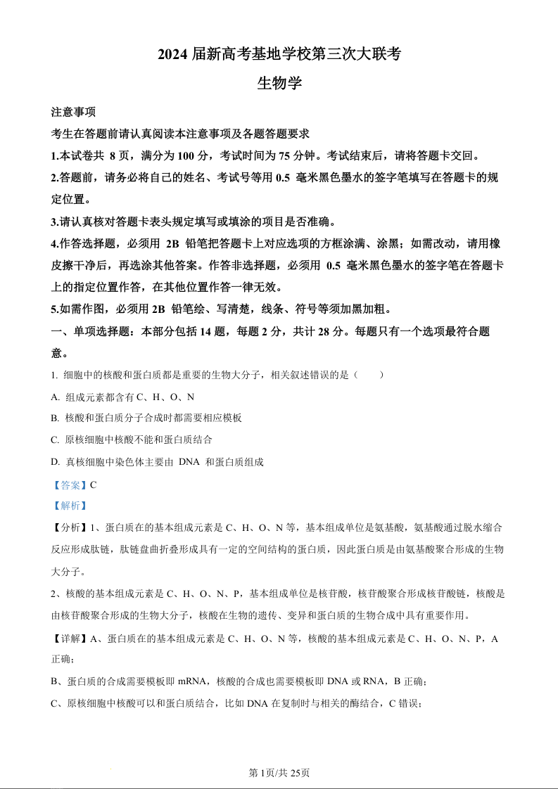 江苏省新高考基地学校2023-2024学年高三上学期第三次大联考 生物答案
