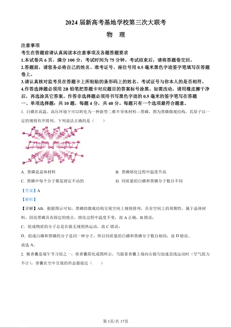 江苏省新高考基地学校2023-2024学年高三上学期第三次大联考 物理答案