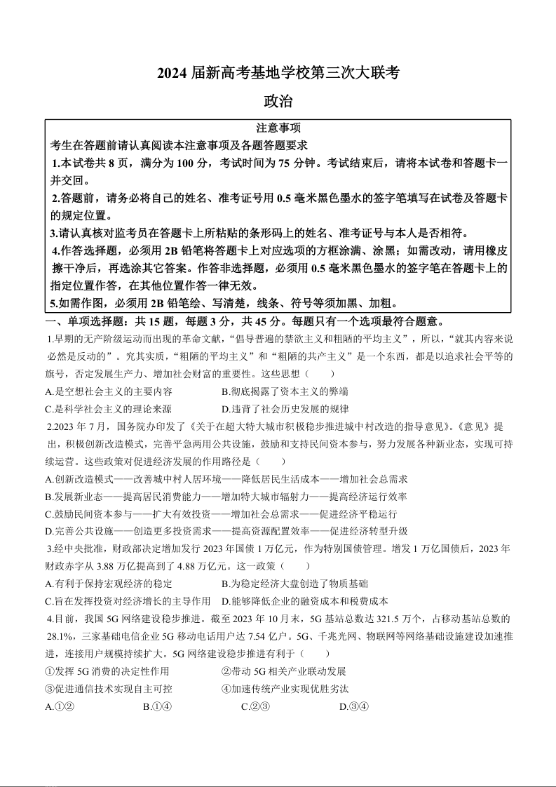 江苏省新高考基地学校2023-2024学年高三上学期第三次大联考 政治